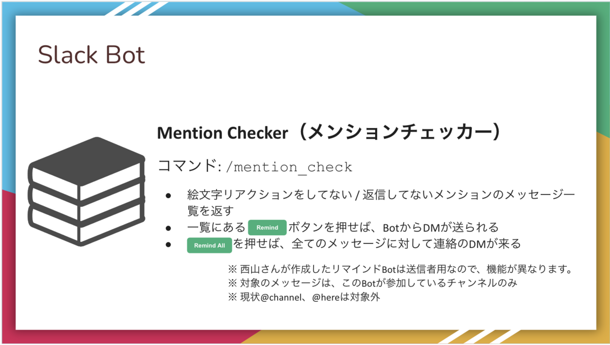 現状としては人の手でリマインドを行なっていたところを、自動化することでリモートワークでのコミュニケーションの質を向上させようという思いから「メッセージの確認漏れを防ぐ新 Slack Bot Mention Checker」 を開発しました。