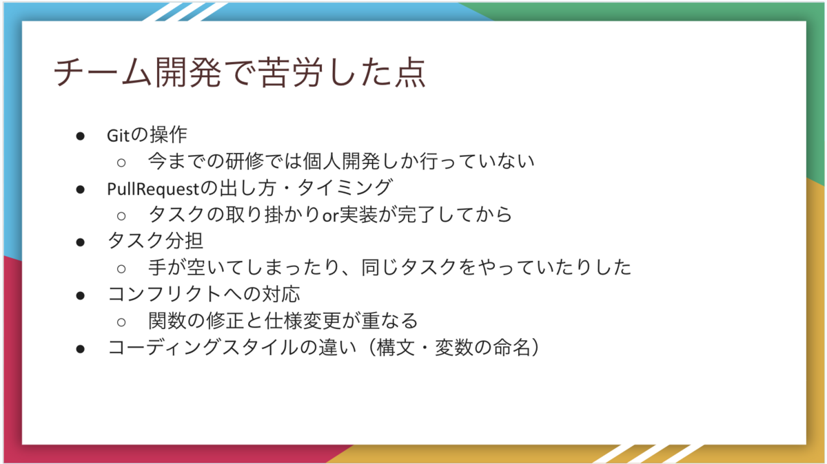 - チーム開発の練習の場として研修中に行い、配属後の業務に活かしていく