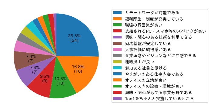 回答で最も多かったのが「リモートワークが可能である」でした。冒頭の記事でも取り上げましたが、弊社エンジニアの殆どはリモートワークがメインであり、執筆時現在でも変わっていません。私自身も出社頻度は月1 ~ 3回ほどで、出社する必要のある用事以外は基本的にリモートワークで業務しています。