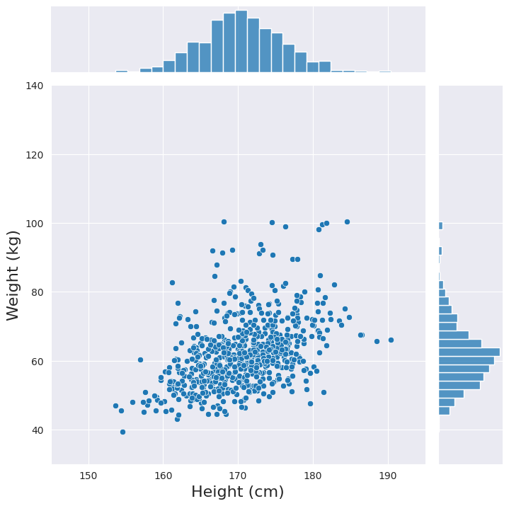 ここまで確率変数同士の従属関係を捉えるコピュラについて説明しました。以下では、実際の活用例を紹介します。コピュラの推定にはstatsmodelsを使用します。分析するデータは、政府統計の総合窓口(e-Stat)で公開されている学校保健統計調査の身長と体重の相関表及び身長別体重の平均値のデータ(17歳男性)を参考にして作成したデータです。データをプロットしてみると、身長は正規分布のような形を示しますが、体重の分布が上側に裾の重い分布を示していることがわかります。さらに散布図から、体重の上側の裾の部分は身長の高い人たちに多く見られる傾向がわかります。