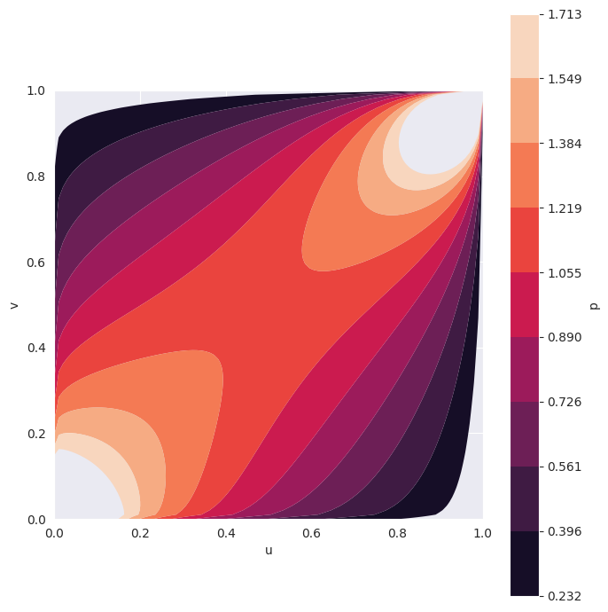 今回は、身長と体重の周辺分布をそれぞれ正規分布とJohnsonSU分布としました。身長のデータに正規分布を当てはめるとパラメータは$(loc, scale)=(170.55, 5.58)$、体重のデータにJohnsonSU分布を当てはめるとパラメータは$(a, b, loc, scale)=(-2.00, 2.35, 46.73, 14.44)$となりました。コピュラの推定にはグンベルコピュラを用い、推定の結果パラメータ$\theta=1.46$でした。推定したコピュラ$C(u, v)$を可視化すると以下のようになります。