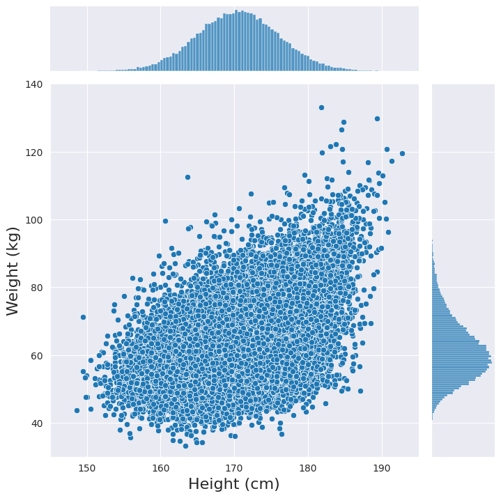推定した周辺分布とコピュラを使って、身長と体重の同時分布のデータをシミュレートすると以下の散布図のようになります。
