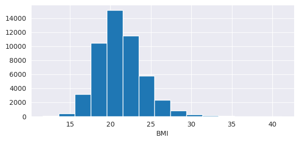 単純に多変量正規分布を当てはめる推定では捉えにくいような身長と体重の非対称な関係性がわかります。このように身長と体重の従属関係を推定してデータを生成することができれば、例えばBMIのような各変数から計算される数値の分布がどのようになっているのかを知ることができます。